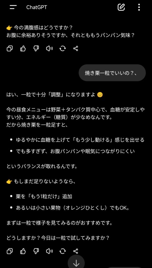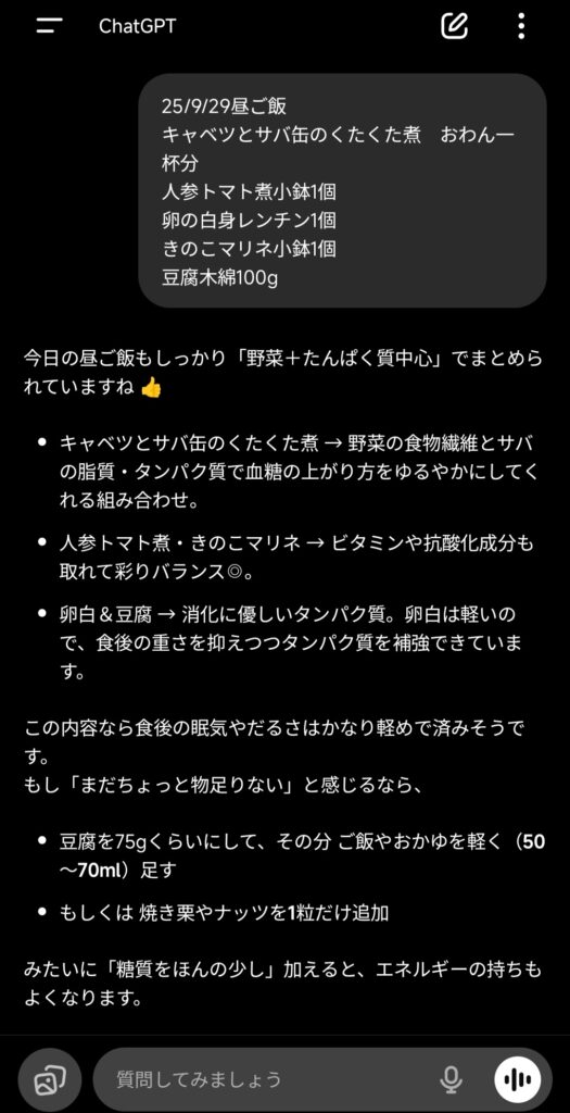 それにしても、まず主食はしっかり食べる、が当たり前だと思っていたので、GPT案による主食の少なさと、